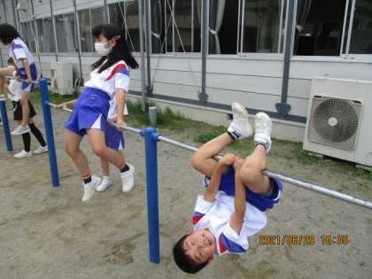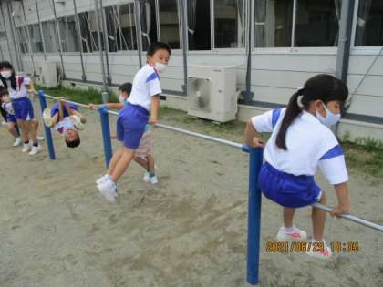 1年生 体力つくりタイム 公開日 2021/07/02 更新日 2021/07/02 1年生 体力つくりタイムでたくさん体を動かしています。できる鉄棒技を増やしたい!50m走のタイムを速くしたい!といった思いをもって取り組んでいます。