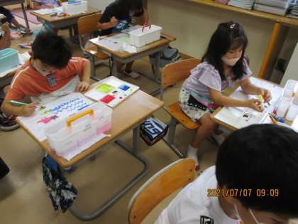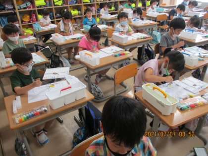 1年生 初めての水彩絵の具! 公開日 2021/07/09 更新日 2021/07/09 1年生 1年生は図工の時間に水彩絵の具を使って、色を塗ったり線を書いたりしました。色鮮やかになっていく画用紙を嬉しそうに見つめていました。最後の片付けまでしっかり頑張りました!