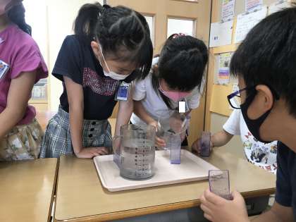 算数科では、水のかさの単位の学習をしています。今日は1dL水が入る容器を用いて、1Lをつくれるか確かめました。ちょうど10杯で1Lになった瞬間、子供たちから歓声が上がりました。10dL=1Lであることを理解することができました。