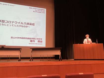 今回は、富山大学医学部小児科講師の種市尋宙先生をお迎えし、第一部に「子どもたちにとっての新型コロナウイルス感染症」と題して、お話しいただきました。続く第二部では、種市先生、谷本校長、PTA会長によるトークセッションが行われました。