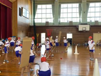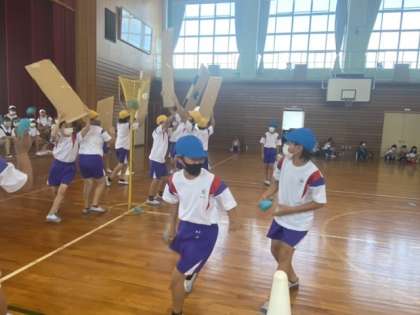 体育の学習の様子です 公開日 2021/09/02 更新日 2021/09/02 5年生 体育科の学習では、投げる運動の力を高めるため、さまざまなルールで玉を入れ合う競技を行っています。写真はその様子です。