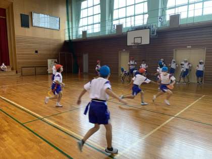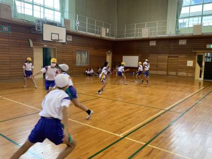 体育の学習で、タグ取り鬼ごっこを行っています。自分のタグを守りながら、相手のタグを取るために作戦を考えていました。