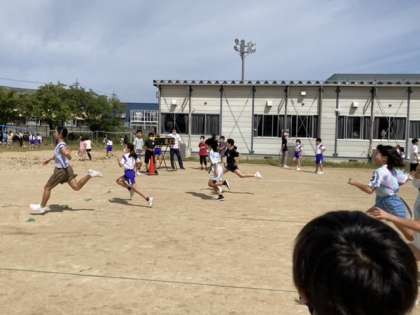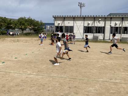 体力つくりタイム 公開日 2021/09/10 更新日 2021/09/10 6年生 体力つくりタイムには、各学年割り振られた曜日に50m走をしています。火曜日は6年生と1年生の日となっており、タイムを計りながら、何本も走る姿が見られました。