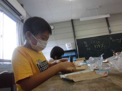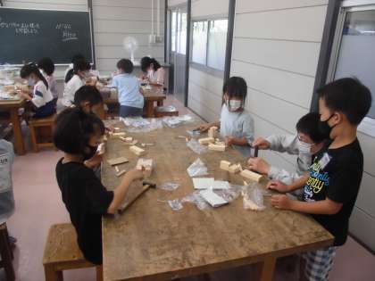3年生 図工 くぎうちトントン 公開日 2021/09/10 更新日 2021/09/10 3年生 かなづちで釘を打って、木を組み立てています。くぎの打ち方を工夫して、自分のイメージしたものをつくっていました。1本1本のくぎを集中してうっていました。
