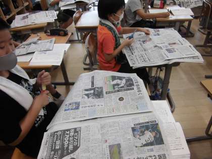 それぞれの面にどんな記事が載っているのか、記事はどのような構成で書かれているのかなど、実際の新聞を見ながら確かめました。