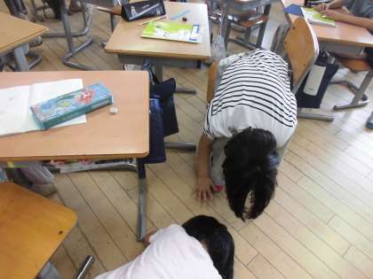 ある男の子が、「ありは小さすぎてかげができていなかった」と発言したことをきっかけに、子供たちは、小さい消しゴムのかすでかげができるのか確かめ始めました。また、手を床に近づけて、光をさえぎられるところにはかげがあること確かめていました。子供の学ぶ意欲を感じました。