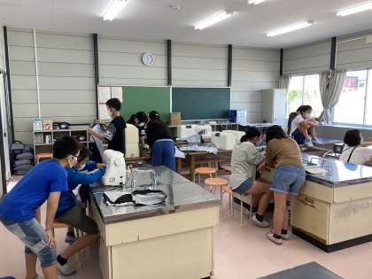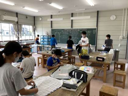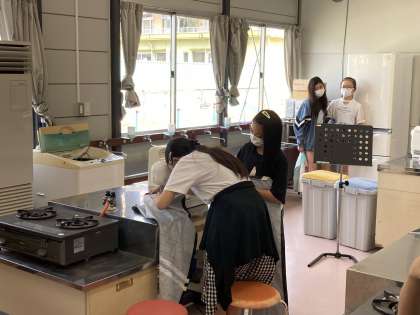 家庭科ではエプロン作りを行っています。アイロンで折り目を付け、まち針で留めたり、しつけ縫いをしたりしてから、ミシンで縫っています。授業が進むにつれ、子供たちの技能が上達し、きれいな縫い目でエプロンが仕上がってきました。完成が楽しみです。