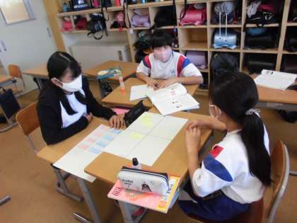 5年生は、国語科で「よりよい学校生活のために」を学習しています。子供たちは、自分たちの学校生活から問題点を見付け、議題を設定して、グループで問題を解決するための手立てを話し合いました。どの子供も自分の考えをもちながら、話合いに参加し、友達の話を聞きながら、解決策を決めていきました。