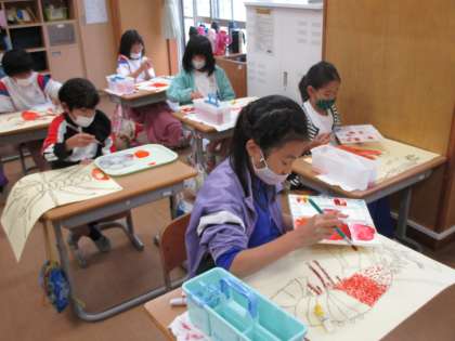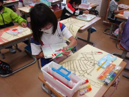 図画工作科の学習では、飼育しているザリガニを題材にした絵を描いています。ザリガニをじっくり観察し、細部までこだわって下描きや色付けをしました。完成が楽しみです。