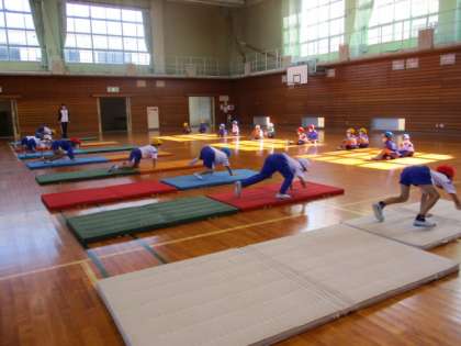 1年生 マット運動 公開日 2021/11/05 更新日 2021/11/05 1年生 運動会が終わり1年生の体育では新しくマット運動の学習が始まりました!最初はたくさんの動物の動きをまねて、体を使う練習からスタートです。少しずつマットとも仲良くなっていきたいです!