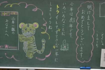 3学期が始まりました 公開日 2022/01/12 更新日 2022/01/12 最近の出来事 朝の2年1組の黒板です。 今年の干支寅を描いた年賀状が、子供たちを迎えました。 また、登校した子供から順に、新しい雑巾を所定の場所にかけました。