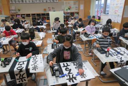 始業式の後、書き初め大会を行いました。冬休みの練習の成果を発揮しようと、真剣に、集中して書き上げました。