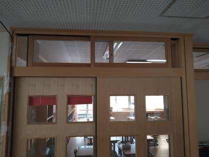 本校では、常に廊下と面した教室の欄間(高窓)は、左の写真のように少しずつ開け、密閉空間にならないよう配慮しています。そして、休み時間には教室の窓を少し開け、外気を入れて換気をしています。森先生からも、「室温が低いと免疫力の低下につながります。メリハリをつけて換気を続けてください。教室の温度は学校環境衛生基準の17度を満たしていましたが、家庭ほど温かくはありません。教室の場所、その日の天候によっても違うので、温度計をみながら調整してください」とお話がありました。