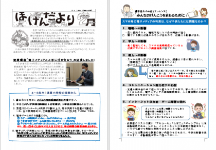 先月、富山大学の種市先生をお招きして実施した健康講座「電子メディアと上手に付き合おう」の内容を2月のほけんだよりに掲載し、本日お子さんを通じて配付しました。