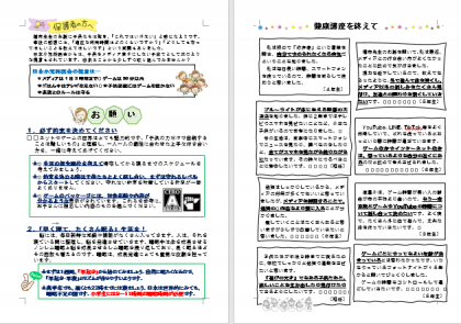 ゲームやネットの世界は、とても魅力的です。子供たちが自分の力だけで自制して使えるようになるまでには、大人の手助けが必要です。ほけんだよりを参考にしていただき、お子さん1人1人に応じた「電子メディアとの上手な付き合い方」を、お子さんと一緒にみつけていただければと思います。