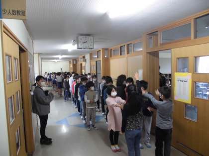 学年で避難訓練をしました。素早く整列する練習や避難経路の確認をしました。1度練習した並び方をすぐに覚え、今日は15秒ほどで99人が静かに整列することができるようになりました。