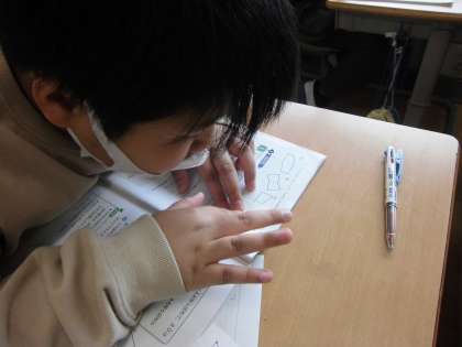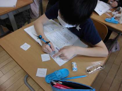 「点対称な図形」:4月20日(水) 公開日 2022/04/22 更新日 2022/04/22 6年生 算数科の学習で点対称な図形について学習しています。 実際に図形を動かしながら、もとの図形とぴったり重なるのはどこか確認しました。