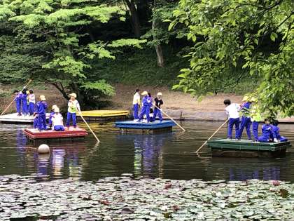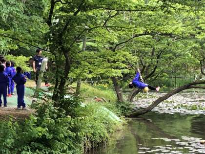 今、午後の活動中です!いかだやターザンロープ、池ジャングル、竹ジャングルと楽しんでいる4年生です!