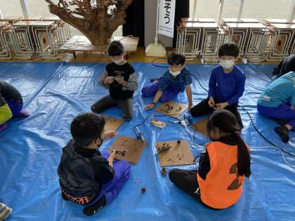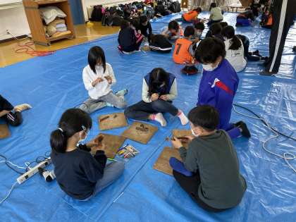 お昼ごはんを食べた後、壁飾りを作っています。宿泊学習の記念です。