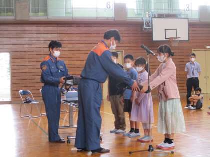 BFCバッジ授与式を行いました。消防署の方から、富山県内や全国で1年間にどれだけ火災が起きているか、富山県民の防災意識の低さなどについて教えて頂きました。