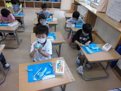 図工の学習で粘土を使いました。子供たちは思い思いの形を作ったり、組み合わせたりして、楽しみながら作品づくりに取り組んでいました。