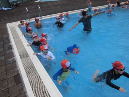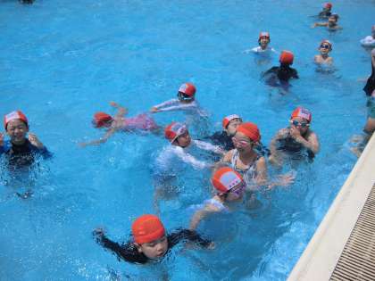 小学生になって初めてのプールに入りました。子供たちは、「気持ちいい!」と元気な声を上げながら、楽しく水遊びをしていました。速星小学校のプールが1年生みんなの笑顔でいっぱいになりました。