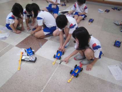 今回はゴムカーを作り、輪ゴムの伸ばす長さによって、車の走る距離がどのように変化するか、実験しました。