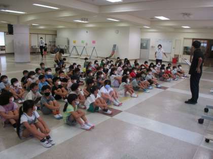 学年集会をしました 公開日 2022/09/03 更新日 2022/09/03 1年生 2学期最初の学年集会では、運動会の種目について、校外学習について、スーパー1年生になるためにがんばることを話しました。また、学年みんなで「もうじゅうがり」をして、他のクラスの友達とも仲良く交流しました。運動会では50m走と、ダンシング玉入れを行う予定です!お楽しみに!