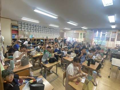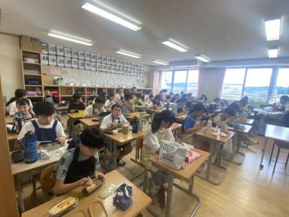あいにくの雨となり、チャレンジ陸上記録会は延期になってしまいましたが、昼食はおうちの人の愛情たっぷりのお弁当をいただきます。