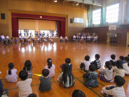 速星小学校の伝統であるお囃子を鑑賞しました。6年生の迫力ある演奏を見て、子供たちは思わず太鼓をたたく真似をしたり、身をのりだしたりして聞いていました。きっと1年生の心に深く残ったと思います。