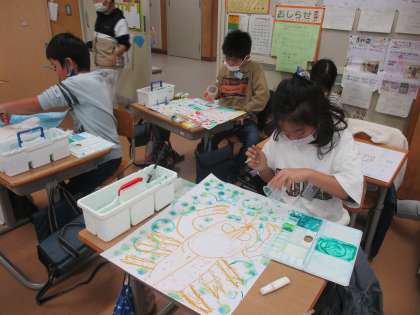 図画工作の学習では、生活科の時間にお世話をしているザリガニの絵を描いています。クロームブックで撮影したザリガニの写真をよく見て、よりリアルに描こうと頑張りました。背景は、スポンジを使って色付けをしました。スタンプのように押したり、絵の具を何色も混ぜて色を広げたり、いろいろなスポンジの使い方を楽しんでいる様子の子供たちでした。