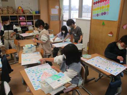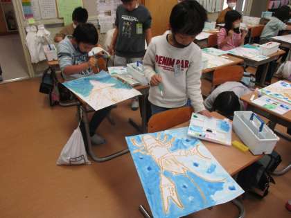 2年生 図画工作 公開日 2022/11/09 更新日 2022/11/09 2年生 図画工作の学習では、生活科の時間にお世話をしているザリガニの絵を描いています。クロームブックで撮影したザリガニの写真をよく見て、よりリアルに描こうと頑張りました。背景は、スポンジを使って色付けをしました。スタンプのように押したり、絵の具を何色も混ぜて色を広げたり、いろいろなスポンジの使い方を楽しんでいる様子の子供たちでした。