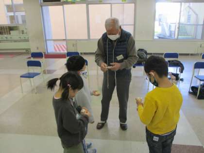 1年生は19日に生活科の学習で長寿会の方々と昔からの伝承遊びに親しみました。子供たちは目を輝かせながら長寿会の方々からこまの回し方のコツを教えてもらったり、一緒に色々な伝承遊びを楽しんだりしていました。