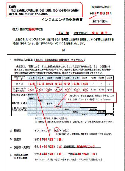 インフルエンザにかかった場合は、登校の際に「インフルエンザ治癒報告書」の提出をお願いします。