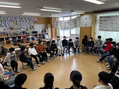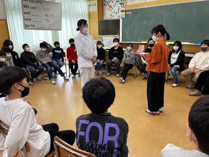 給食週間の活動で、調理員さんを教室に招き、交流会を行いました。フルーツバスケットや調理員さんへの質問コーナーで盛り上がった後に、子供たちからの感謝の手紙を渡しました。