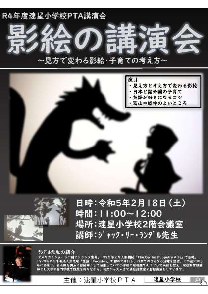 PTA講演会 公開日 2023/03/06 更新日 2023/03/06 速小ニコニコPTA 研修部です。 2月18日にPTA講演会を開催しました。 講師にジャック・リー・ランダル氏をお招きし、影絵公演を行いました。 講師は婦中町に在住し、同じ子育て世代でもあるため、親近感を感じることができ、とても引き付けられる内容でした。 また、影絵を通じて聞く側が、新しい視点・発見をする事の出来る、実りある講演会となりました。 今後も研修部の講演会を、継続して実施していきたいと思います。