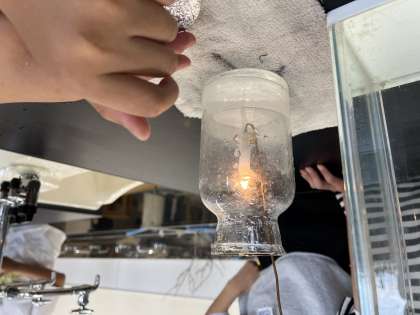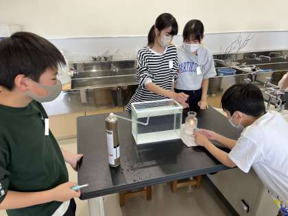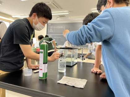 理科では、燃焼と空気の関係について調べました。水上置換で気体を集気びんに集め、火の付いたろうそくを入れると、気体によって違った様相を呈しました。班で協力して、スムーズに実験に取り組んでいました。