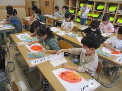 図画工作科では、「にこにこおひさま」を描きました。一人一人、自分の思い描くおひさまを表現することができました。