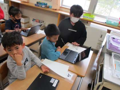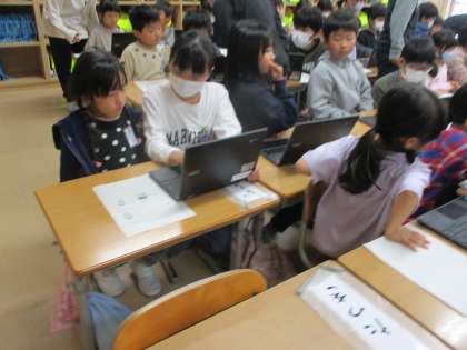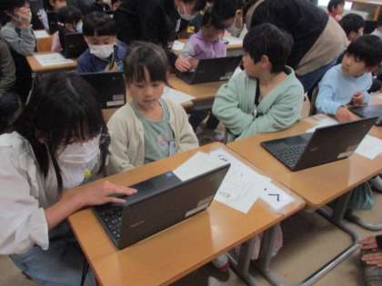 1年生が初めてChromebookを開きました。アカウントの入力やClassroomアプリの設定、生活アンケートを答えるお手伝いをしました。生活アンケートのときは、1年生にも伝わる分かりやすい言葉に言い換えたり説明したりと、とても頼もしい姿を見ることができました。