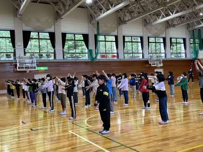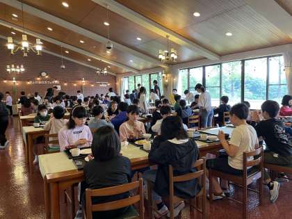 宿泊学習ニ日目、小雨混じりの朝となりました。朝の集いは急遽、体育館で行うことになりました。ラジオ体操で身体を動かし、活動開始です。朝食では甘い卵焼き、鮭と美味しくいただきました。