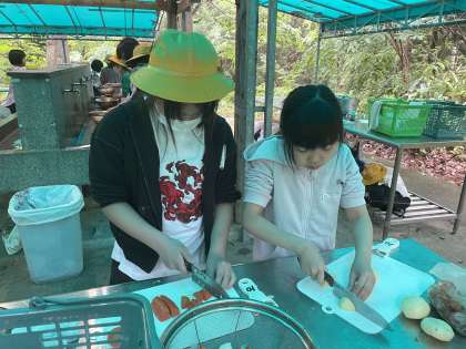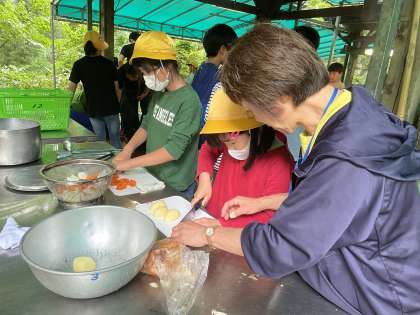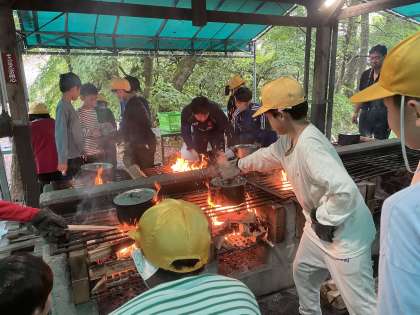 5年生 宿泊学習 野外調理 公開日 2023/05/20 更新日 2023/05/20 5年生 屋根付きの炊事場で、カレーライスづくりに挑戦。かまど担当は、薪を組んで火起こし、調理担当は野菜を細かく包丁で切りました。お米も研いで、水の量を手を使って測る方法を教えていただきました。