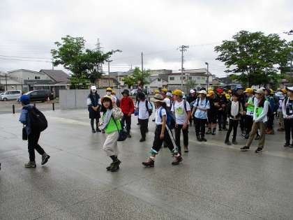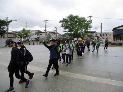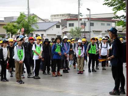 昨日の雨で、延期になった歩行会を行います。児童玄関で注意事項を確認した後、元気に出発しました。
