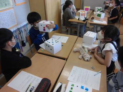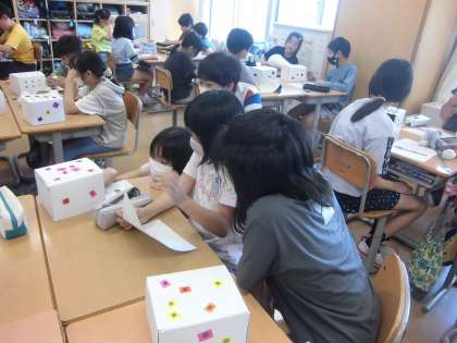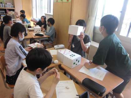 「のぞいてみると」:5年生 公開日 2023/06/05 更新日 2023/06/05 5年生 図画工作科で「のぞいてみると」の作品を紹介し合いました。各グループで工夫したところなどを伝え合い、実際にのぞいてみながら、友達の作品の良さも感じている子供たちでした。
