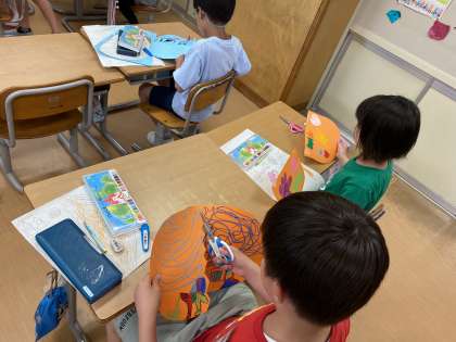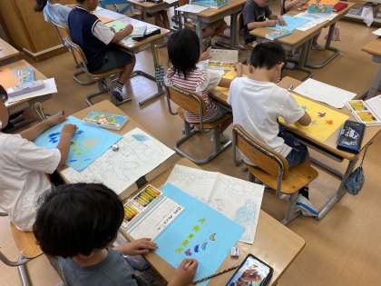 図工の学習で、ふしぎなたまごをの絵を描いています。子供たちはたまごの形や模様、割れ目などを考えながら思い思いのたまごを描いていました。