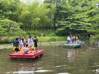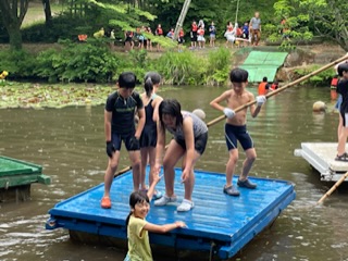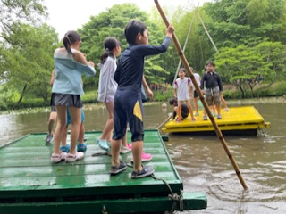 いかだ遊びでは、班の仲間と協力しながら、筏で池を浮遊したり漕いだりするのを楽しみました。