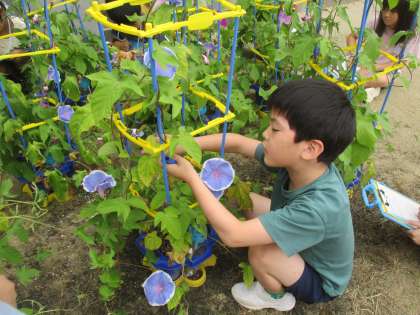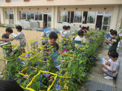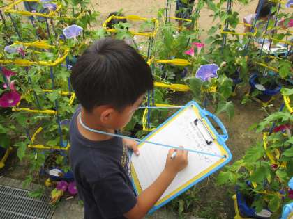 1年生 きれいな花が咲いたよ 公開日 2023/07/05 更新日 2023/07/05 1年生 大切に育てているあさがおが続々と花を咲かせています。様々な色のあさがおに大喜びの子供たちです。細かいところまで観察し、いろいろなことを発見をしました。