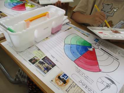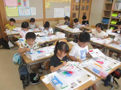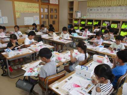 1年生 図画工作 公開日 2023/07/06 更新日 2023/07/06 1年生 初めて水彩道具を使いました。使い方を学んだ後、絵の具の色の濃淡を楽しみました。水をつけると色が薄くなる!新たな発見をした子供たちでした。