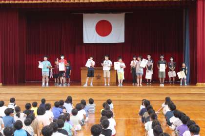 全校の前で、空手、柔道、相撲、リレー、サッカーで活躍した子供たちの受賞紹介がありました。その後、将棋、相撲で全国大会に出場する2名に、エールを送りました。