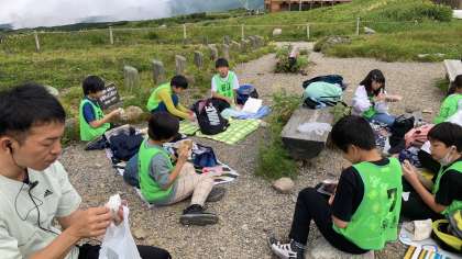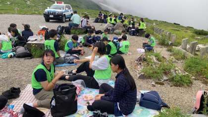 室堂山荘の広場で昼食です。おいしいお弁当に笑顔が広がっています。