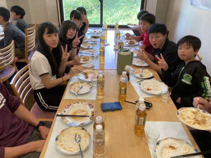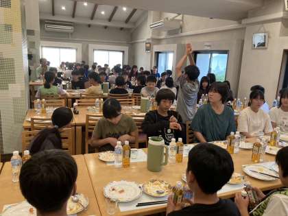 立山荘での夕食の様子です。 子供たちも引率教員も元気です。明日に向けて体力を蓄えます。